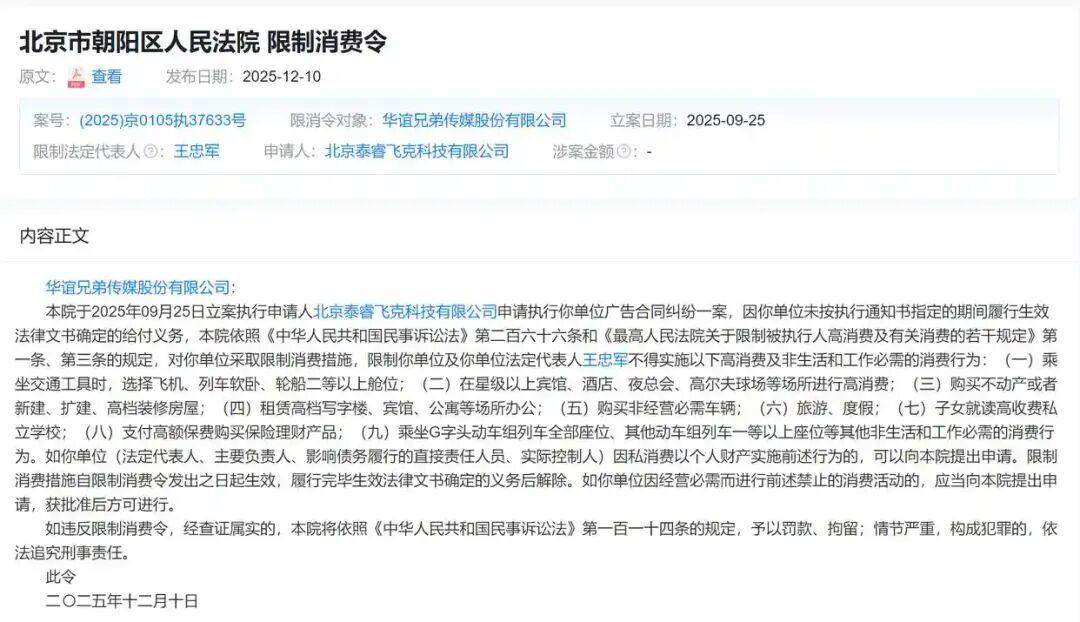 导读:【7473万元执行案件缠身!华谊兄弟王忠磊、王忠军被限高 所持股份已100%被冻结】红星资本局12月29日消息,天眼查APP显示,近日,华谊兄弟电影有限公司、华谊兄弟传媒股份有限公司(300027.SZ)及两公司法定代表人王忠磊、王忠军被限制高消费,涉及7473万元执行案件,执行法院为北京市朝阳区人民法院。" />