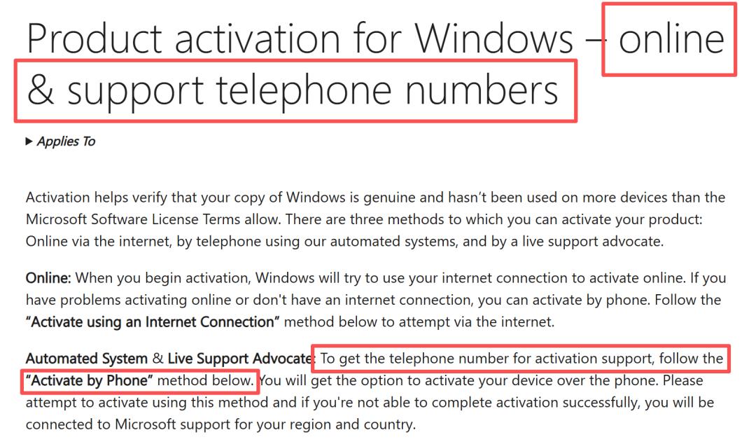 讽刺的是,截至发稿,微软的官方支持文档仍然保留着“可以通过电话激活 Windows”的描述,但实际情况却是:电话号码还能拨通、自动语音还能播放,但激活流程已被彻底移除。