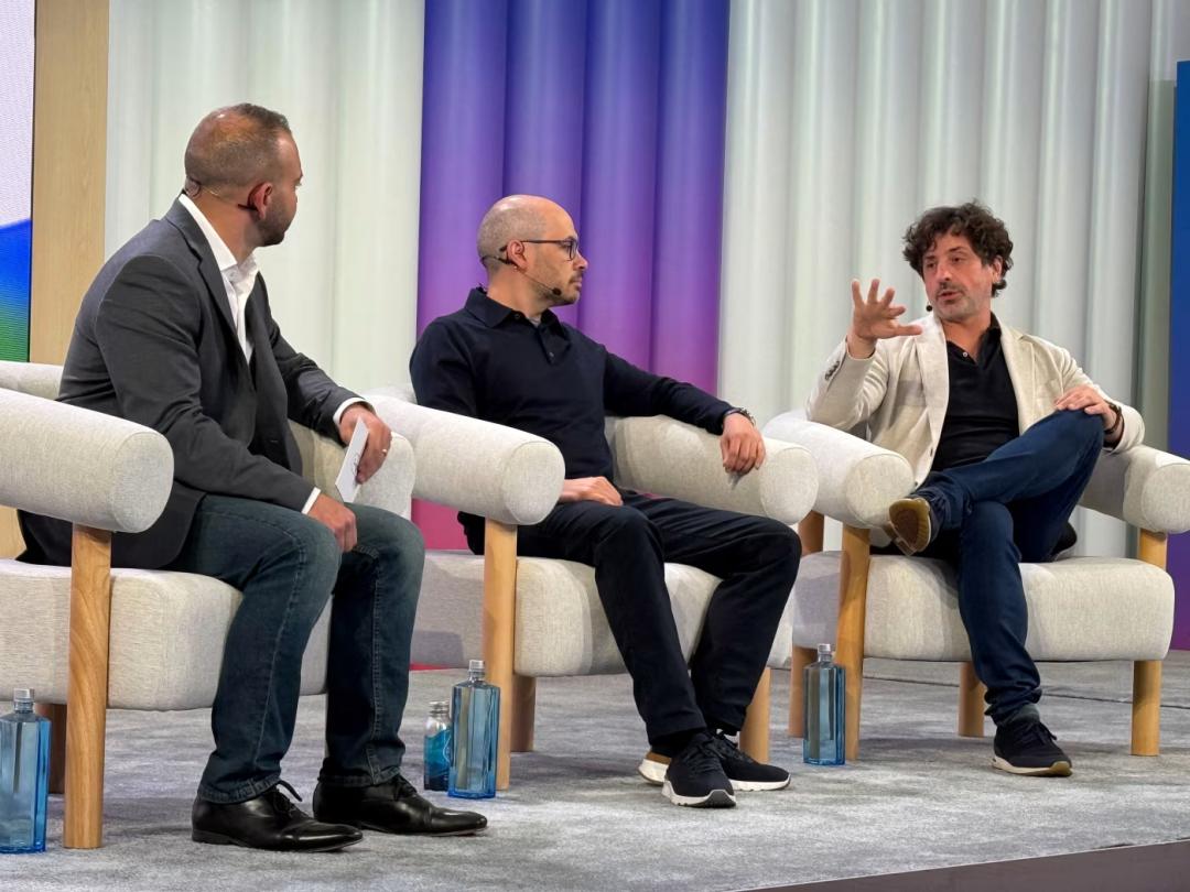 谷歌联创谢尔盖·布林(右)在年度开发者大会上与DeepMind部门负责人Hassabis交谈