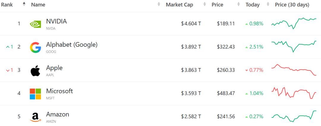 Alphabet当前市值约为3.885万亿美元,略高于苹果的3.846 万亿美元。而英伟达依然以4.595万亿美元的市值遥遥领先,稳居全球第一。