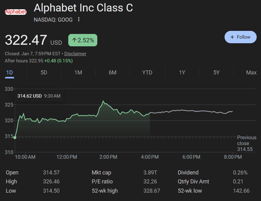 2025年,谷歌股价累计上涨了65%,成为大型科技股中表现最好的公司;今年以来,它股价又继续上涨了2.9%。