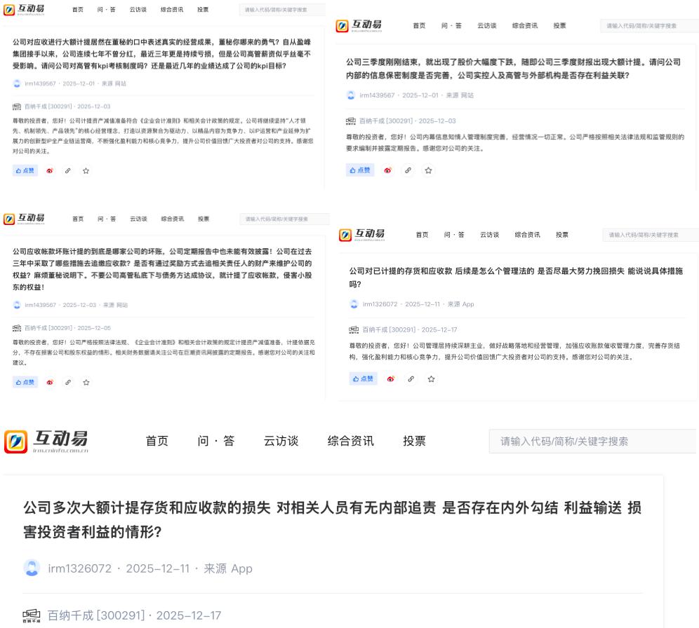 “所计提的应收账款坏账究竟对应哪家债务方,为何在报告中不予披露?”在互动易平台,投资者纷纷质问,强烈要求公司说明,过去几年为追回欠款到底采取了哪些具体措施,是否对失职人员进行过内部追责,以及对已计提资产有何后续挽回计划。最关键的是,这一系列操作是否涉及内外勾结、利益输送,最终损害了广大中小股东的权益。