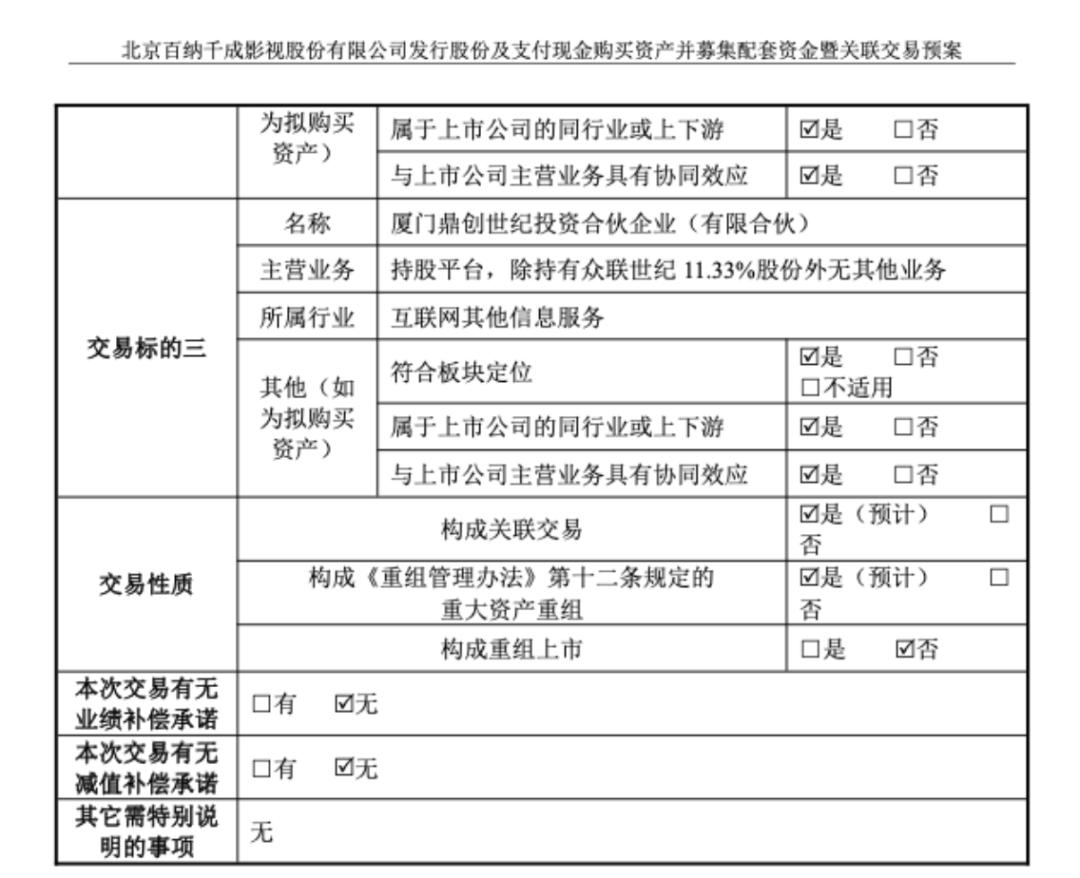 中国企业资本联盟副理事长柏文喜表示,根据现行《重组管理办法》,若交易对方非关联方、且不构成控制权变更,可“市场化协商”不设业绩承诺 。百纳千成此次交易很可能符合这一“例外条款”。