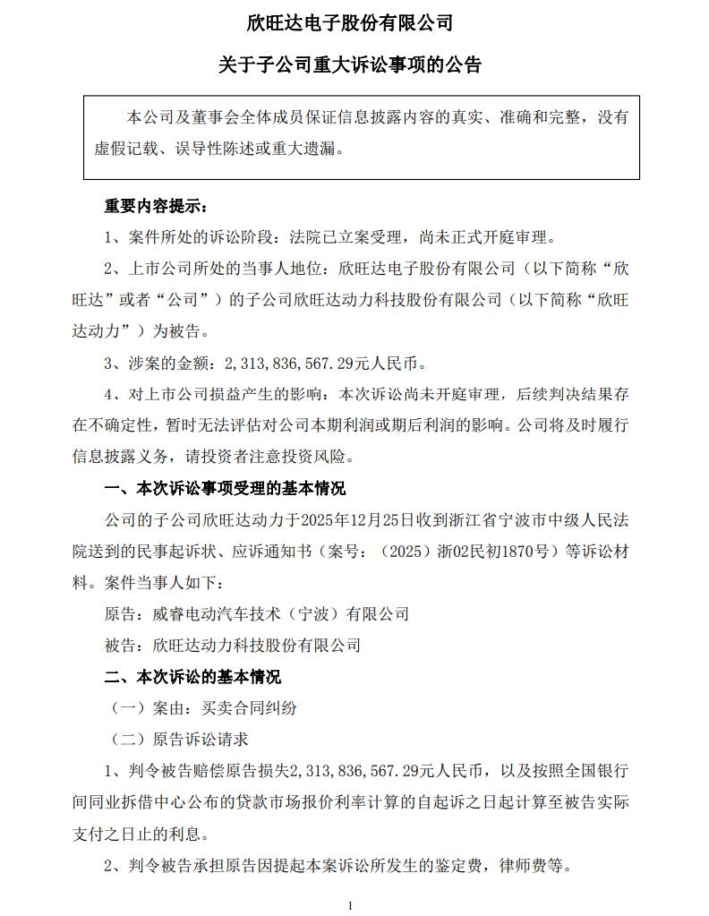 索赔金额相当于欣旺达一年半的净利润。据了解,此次诉讼是由于子公司欣旺达动力在过去的2021年6月至2023年12月期间,向威睿提供的电芯存在质量问题,并造成了损失。