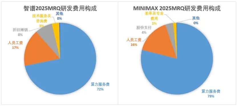 再来看一下智谱和MiniMax研发费用的细分类别开支,以今年已披露的研发费用构成来看,智谱和MiniMax的研发投入结构高度一致。