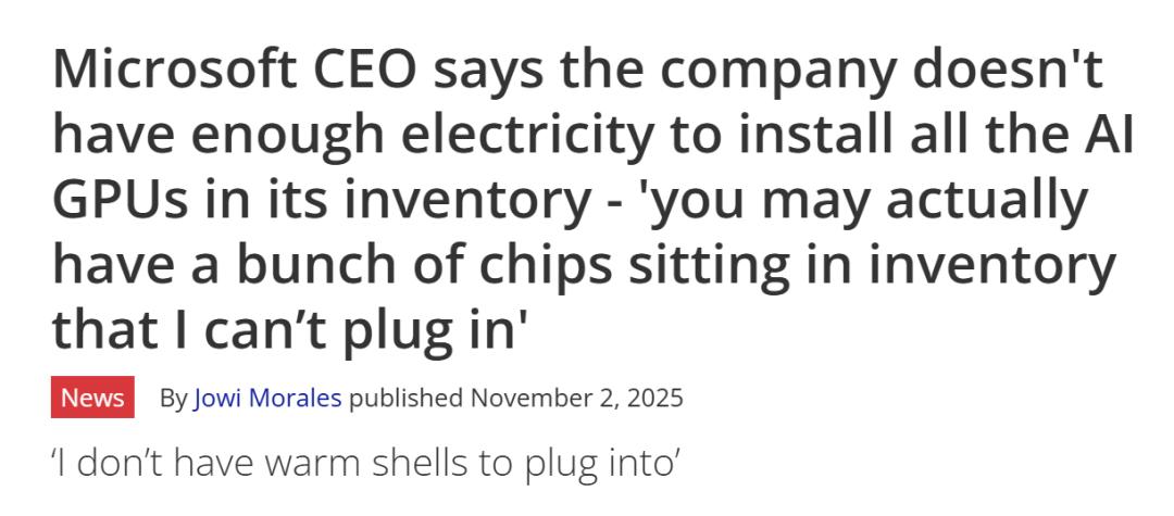 在纳德拉看来,目前的核心瓶颈不在于缺少芯片供应,而是缺少「热壳」——