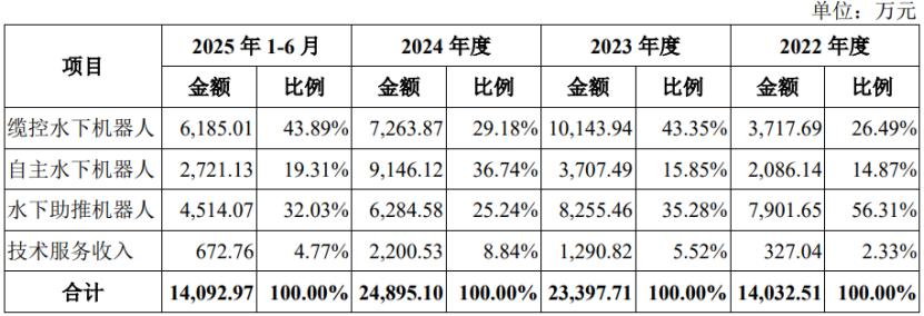 2024年公司来自缆控水下机器人、自主水下机器人、水下助推机器人、技术服务的营收占比分别为29.18%、36.74%、25.24%、8.84%。
