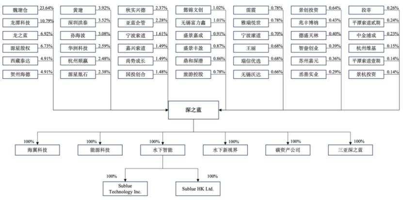 本次发行前,魏建仓直接持有深之蓝约23.64%股份,通过龙之蓝、龙潭科技控制公司约17.7%的股份表决权,合计控制公司41.34%的股份表决权,为实际控制人。