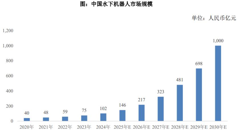 2024年中国水下机器人市场规模为102亿元,随着产品应用市场持续拓展,预计2025年达到146亿元,2030年达到1000亿元,2025年至2030年的年复合增长率预期约为46.93%。