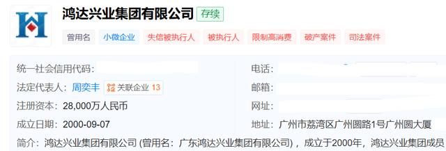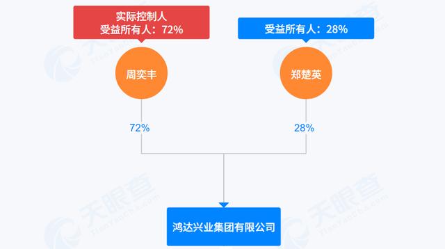 天眼查显示,鸿达兴业集团成立于2000年9月7日,注册资本为2.80亿元,法定代表人是周奕丰,股权结构为周奕丰持股72%、郑楚英持股28%,二人为夫妻关系。