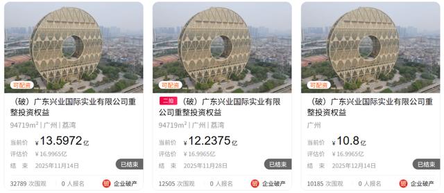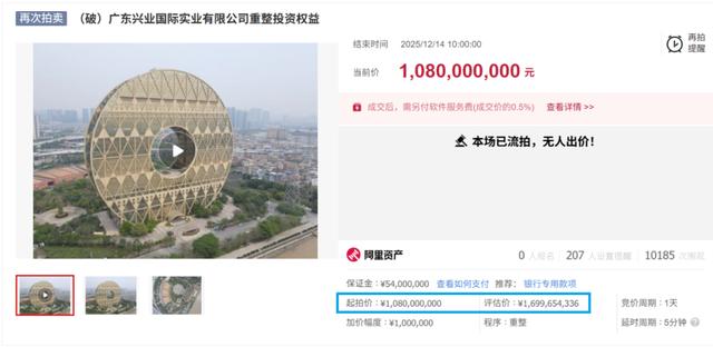 时隔两年之后,2025年11月,广州圆大厦开始单独拍卖,也是2025年第一次拍卖,起拍价为13.5972亿元,但是在11月14日流拍;第二次起拍价降至12.2375亿元,再度于11月28日流拍;第三次拍卖时间是12月13日至14日,虽然起拍价降至10.8亿元,较评估价几乎为六三折,并且有10185人次围观,但是依旧因无人竞拍而第三次流拍。