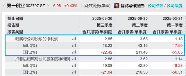 仅就第三季度而言,第一创业实现营收11.53亿元,同比增长31.48%,但环比下降1.55%;归母净利润2.85亿元,同比增长18.23%,环比下降22.42%。