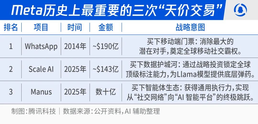 根据Meta和Manus的官方公告及公开信息显示,这笔交易金额达数十亿美元,成为Meta成立以来规模第三大的收购案,仅次于收购WhatsApp以及此前对Scale AI的战略性投资。