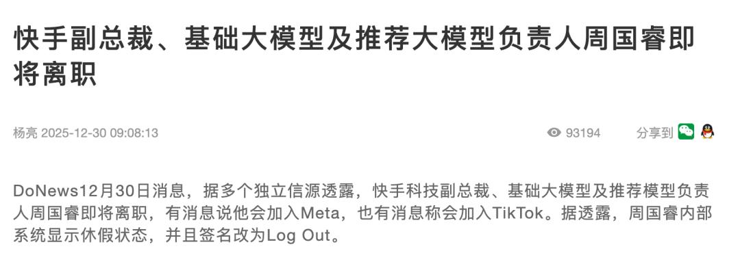 今天,多个媒体爆料,快手副总裁、基础大模型及推荐模型负责人周国睿即将离职。