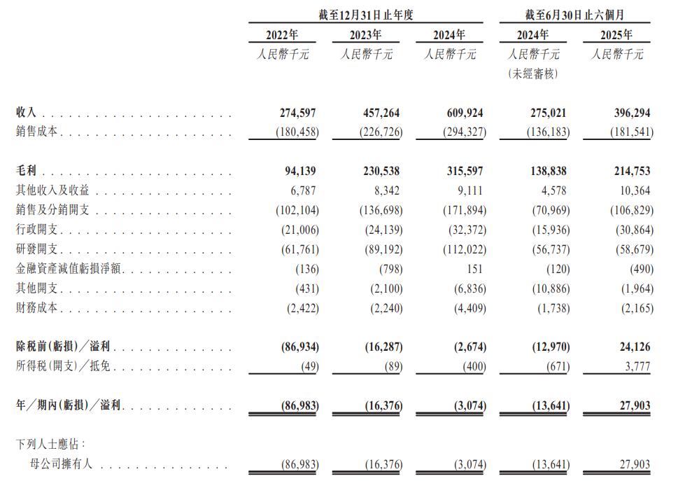 招股书显示,2022年、2023年、2024年及2025年上半年,卧安机器人收入分别为2.75亿元、4.57亿元、6.10亿元及3.96亿元;毛利分别为9413.9万元、2.31亿元、3.16亿元及2.15亿元;期内溢利分别为-8698.3万元、-1637.9万元、-307.4万元及2790.3万元。