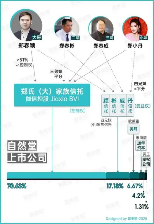 经招股书披露,自然堂集团在上市前的最新股权结构,可以分为三部分:郑氏家族信托、投资方、员工期权池。