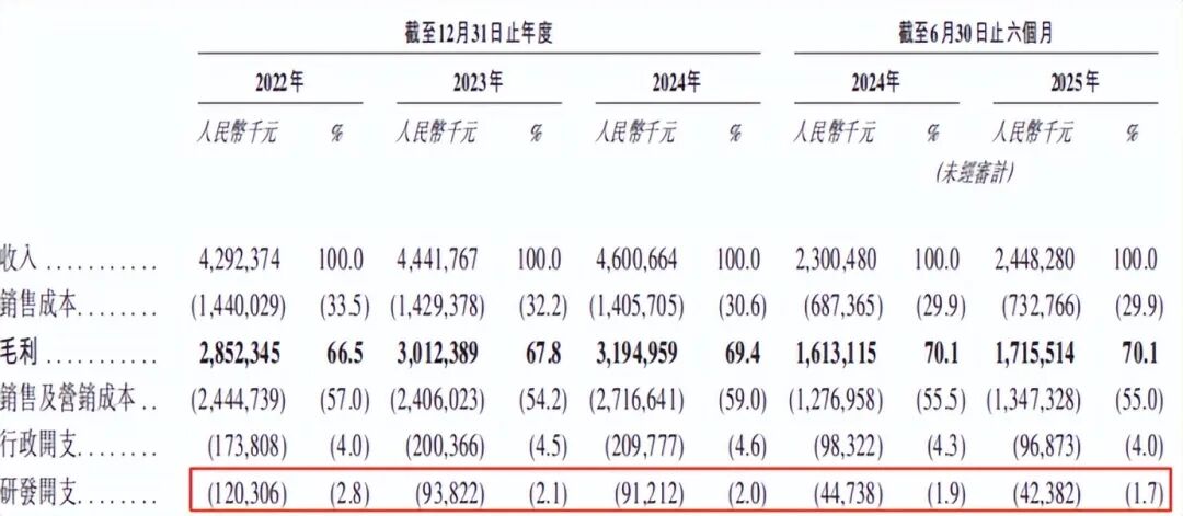 招股书显示,2022年至2025年上半年,自然堂本就不多的研发费用率逐年走低,分别为2.8%、2.1%、2.0%与1.7%。