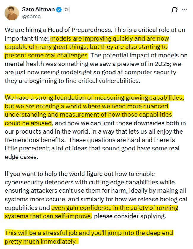 奥特曼之前的推文里也提到过,「我们正在看到模型发现关键安全漏洞,而我们正在运行能够自我改进的系统」。