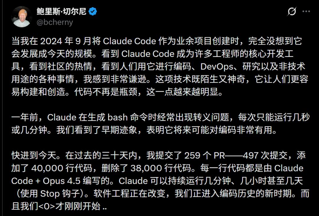 在过去的三十天里,他提交了259个PR——497次提交,添加了40,000行代码,删除了38,000行代码。每一行代码都是由Claude Code + Opus 4.5编写的。