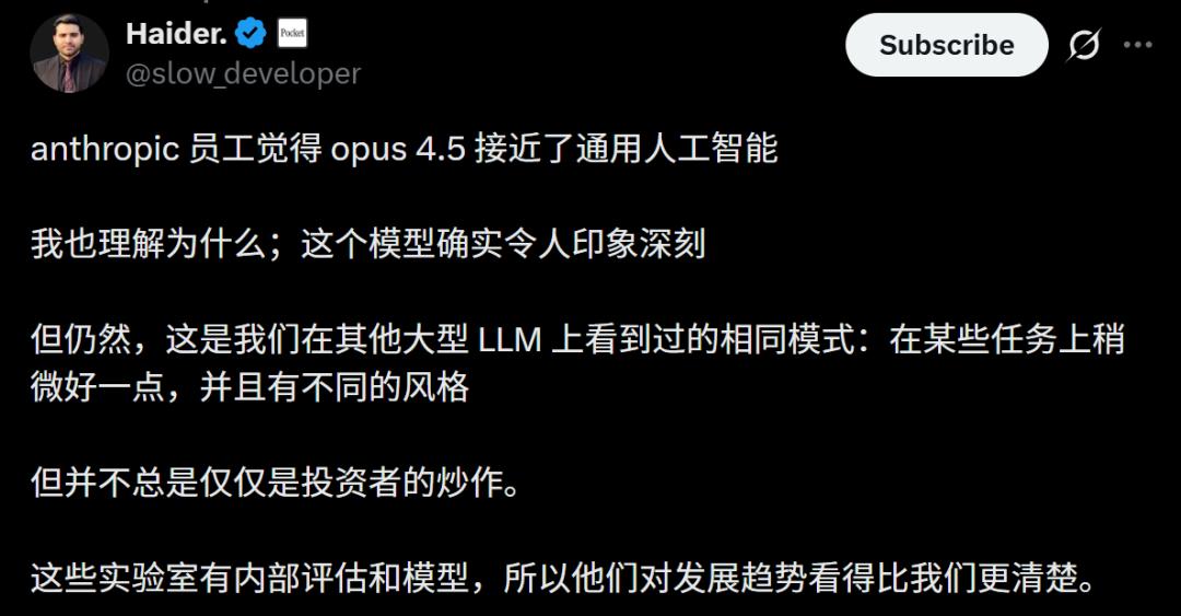 最近,也有一位Anthropic员工表示,自己认为Claude Opus 4.5已经接近了AGI。