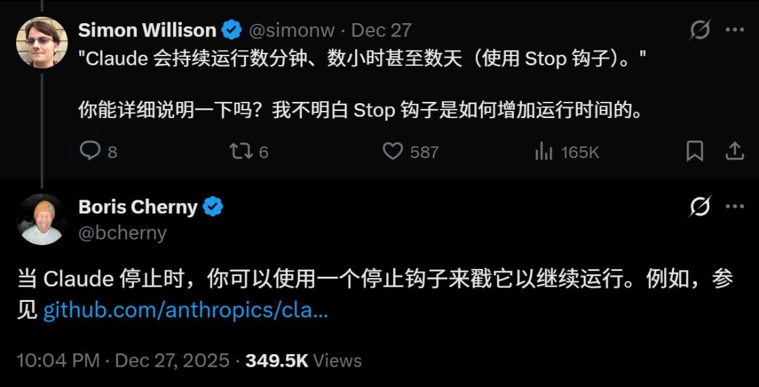 也有人好奇为什么Claude可以持续运行好几天,大牛工程师解释道,当它停止时,可以使用一个停止钩子来「戳」它,让它继续运行。