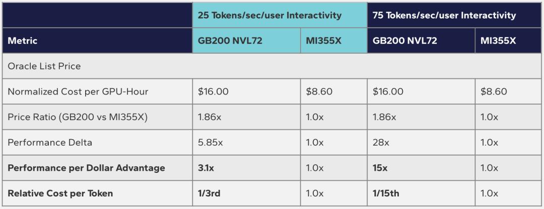按单GPU口径,MI355X价格大约只有GB200 NVL72配置的一半;