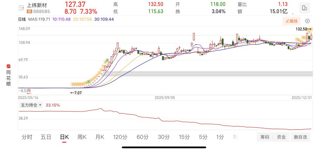 上纬新材更是2025年全A股最靓的仔,上涨超过18倍。而在2025年最后一个交易日,刚刚出任上纬新材董事长的彭志辉,发布了上纬新材首个2C产品——上纬启元Q1.受到这个消息的影响,上纬新材盘中大涨超过11%,股价创下历史新高,收盘市值513.76亿。
